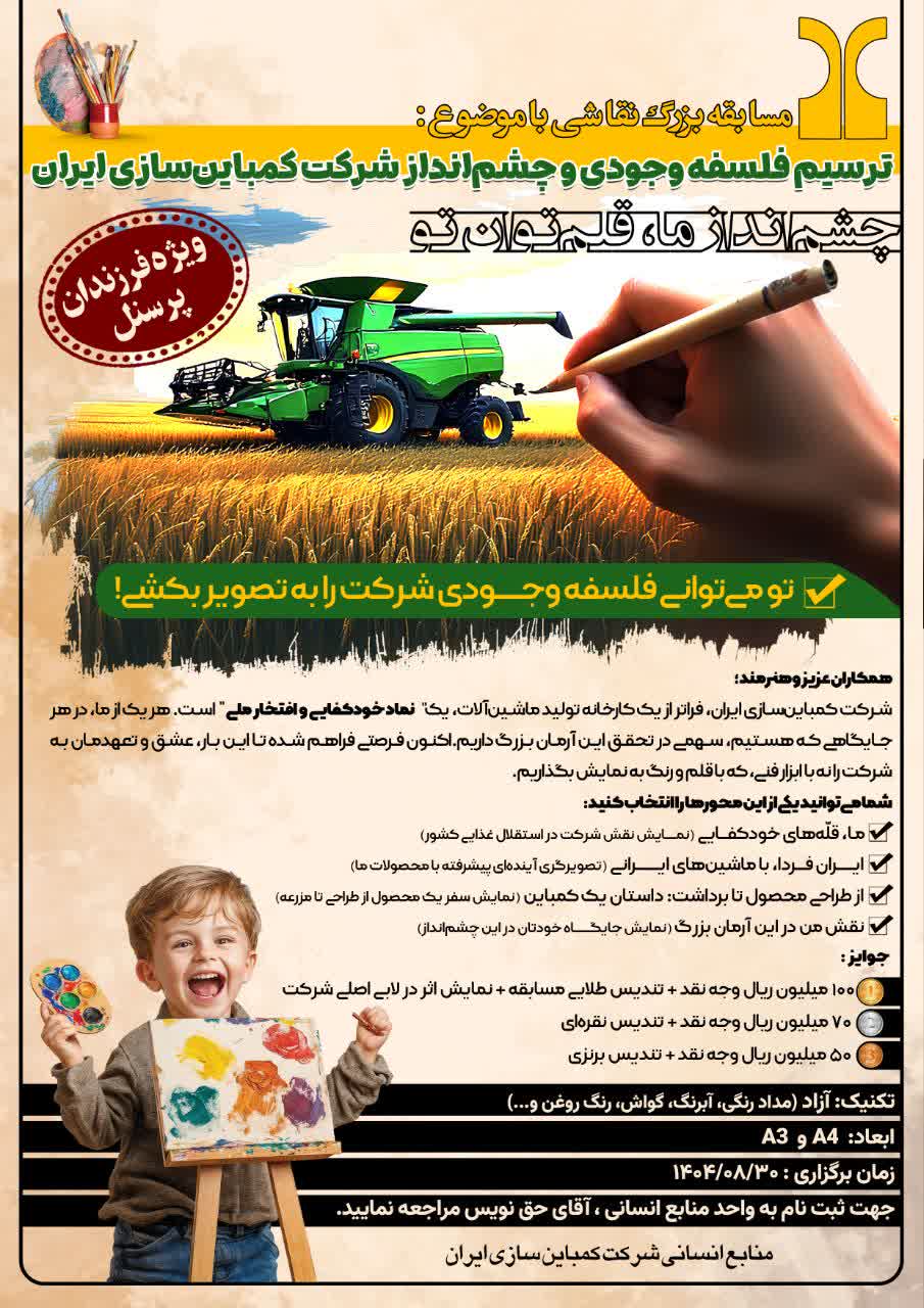 به نقل از روابط عمومی شرکت کمباین سازی ایران مسابقه بزرگ نقاشی با رویکرد ترسیم فلسفه وجودی و چشم انداز شرکت کمباین سازی ایران و با حضور جمع کثیری از خانواده و فرزندان کارکنان شرکت کمباین سازی ایران به همت مدیریت عامل و منابع انسانی شرکت در روز جمعه هفتم آذر ماه برگزار گردید.